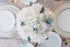 An all-white garden rose centerpiece with dusty miller in a antique gold footed urn.