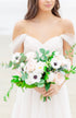 The Charleston bride bouquet is a romantic blend of anemones, roses, and various greens including eucalyptus, rucus, and lambs ear in soft hues of peach, white and gray. A gorgeous bouquet for a modern romantic look.